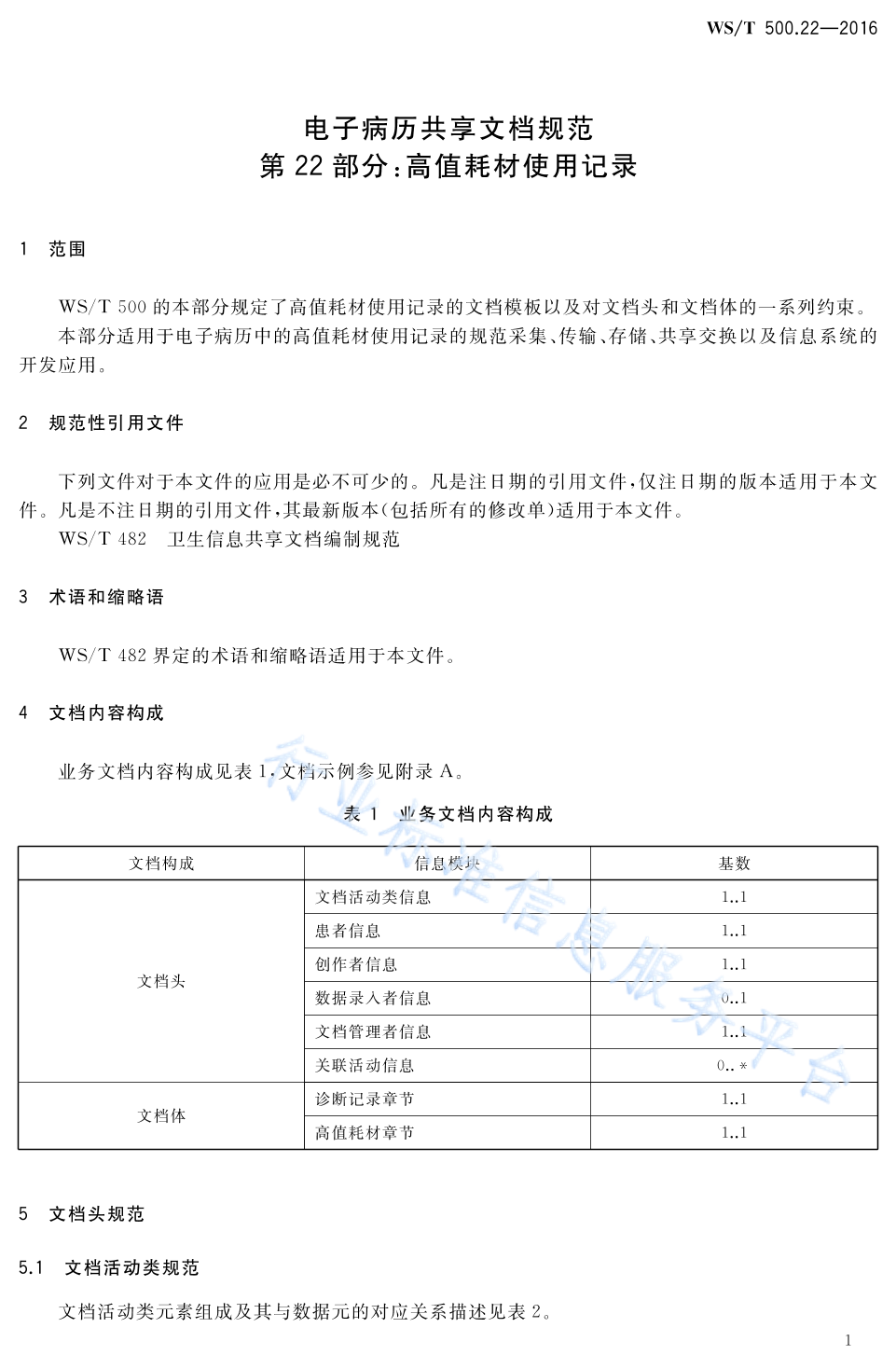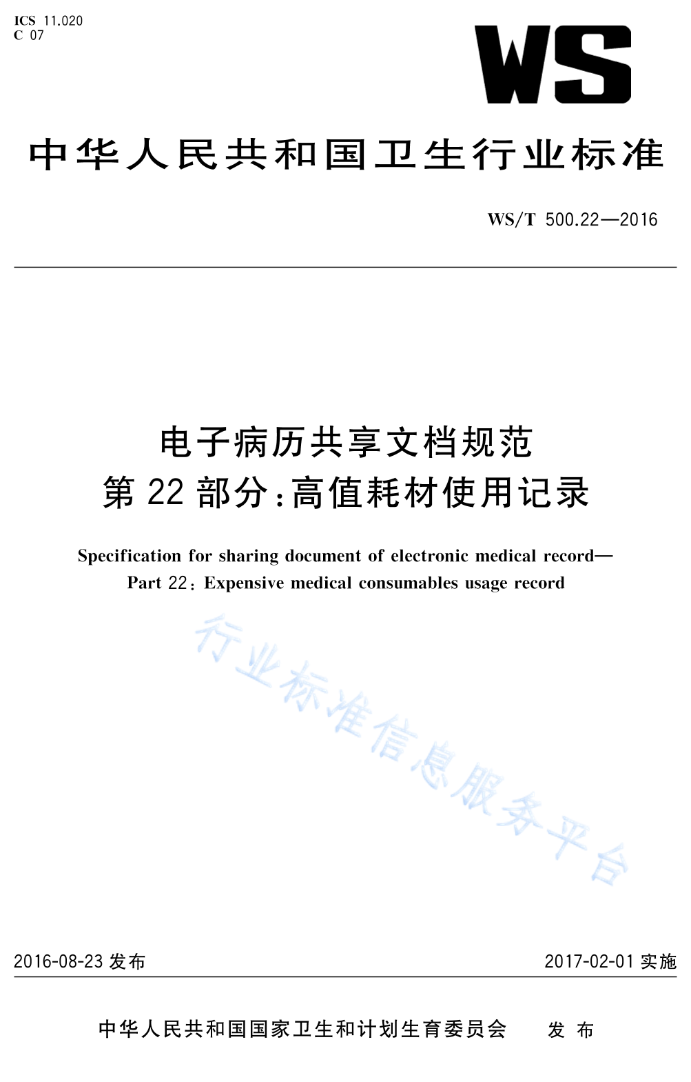 WS/T 500.22-2016 电子病历共享文档规范 第22部分:高值耗材使用记录