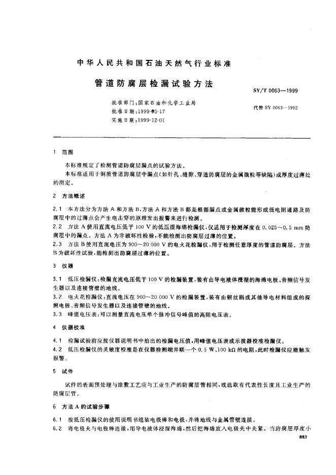 SY 0063-1992 管道防腐层检漏试验方法
