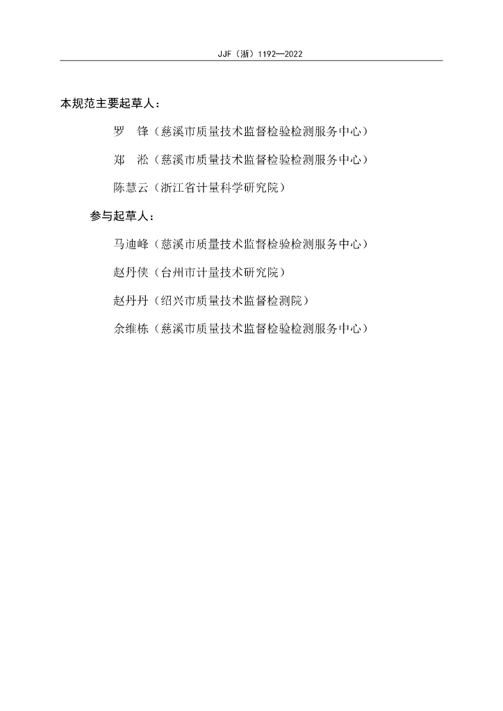 罗锋(慈溪市质量技术监督检验检测服务中心)、郑淞(慈溪市质量技术监督检验检测服务中心)、陈慧云(浙江省计量科学研究院)、马迪峰(慈溪市质量技术监督检验检测服务中心)、赵丹侠(台州市计量技术研究院)、赵丹丹(绍兴市质量技术监督检测院)、余维栋(慈溪市质量技术监督检验检测服务中心)