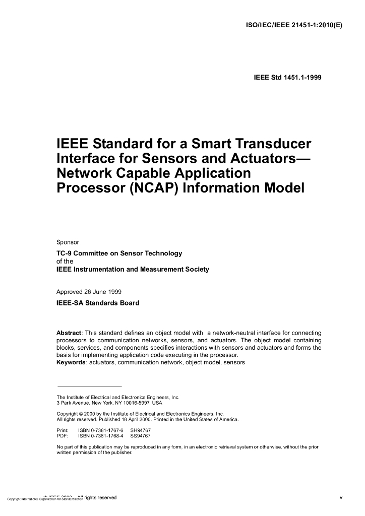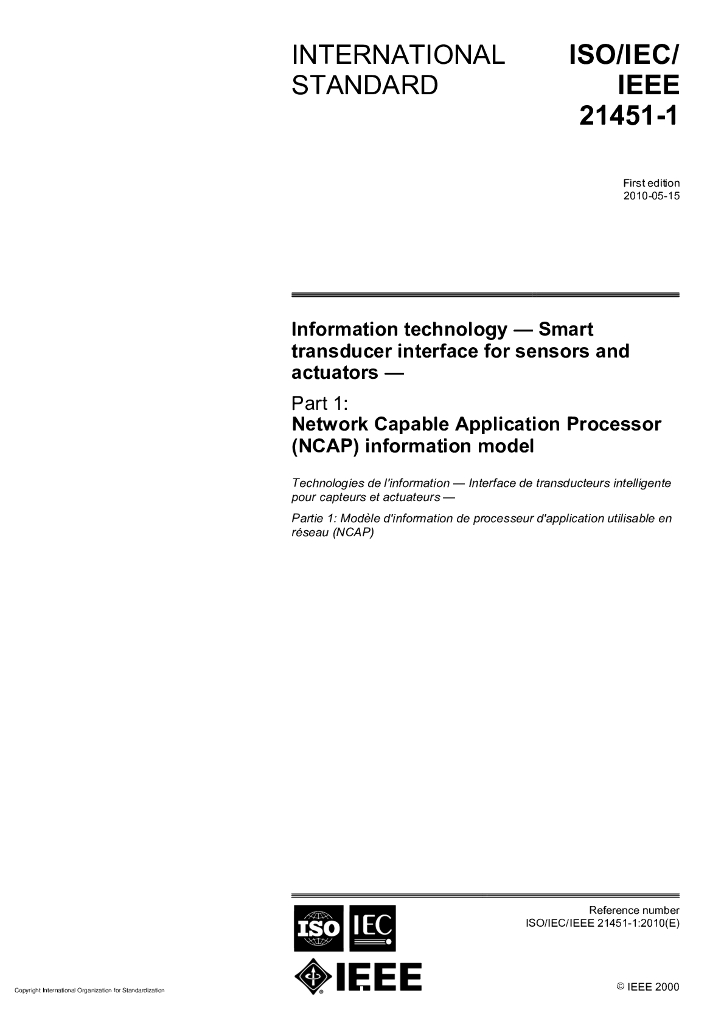 ISO/IEC/IEEE 21451-1-2010 信息技术 传感器和执行器用智能变送器接口 第1部分:网络适配应用处理器信息模型