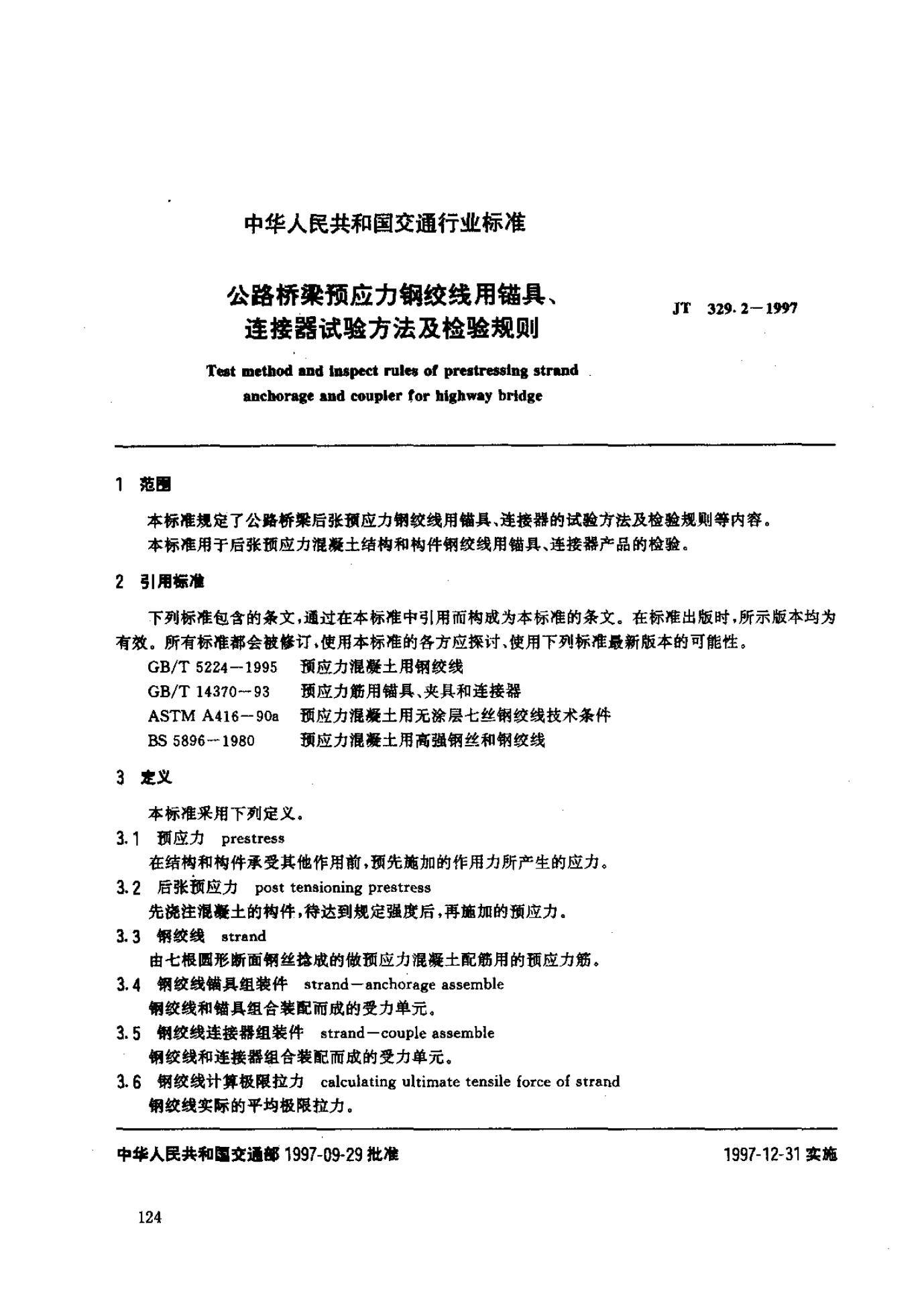 JT/T 329.2-1997 公路桥梁预应力钢绞线用锚具、连接器试验方法及检验规则