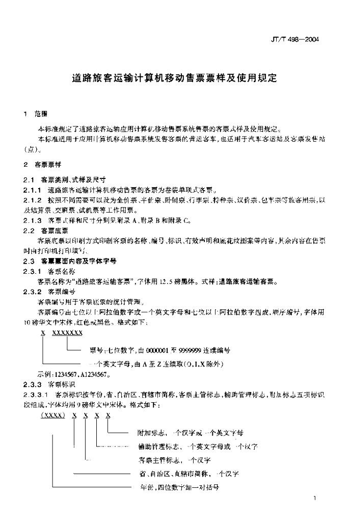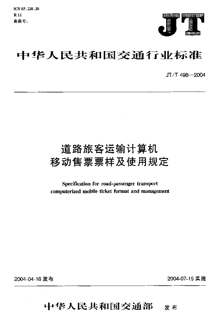 JT/T 498-2004 道路旅客运输计算机移动售票票样及使用规定