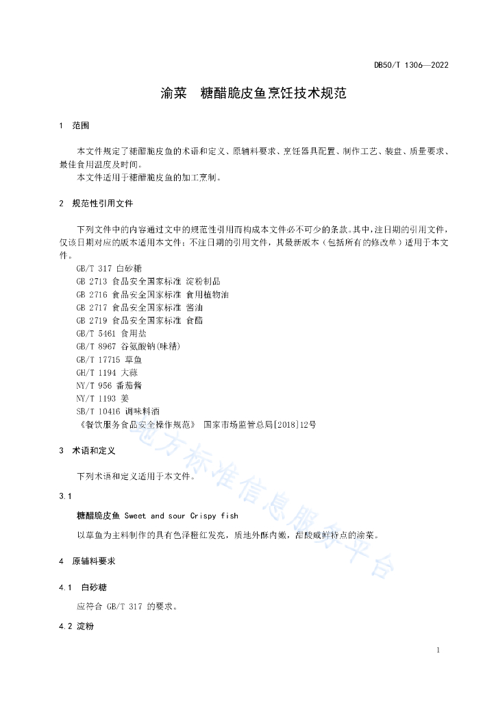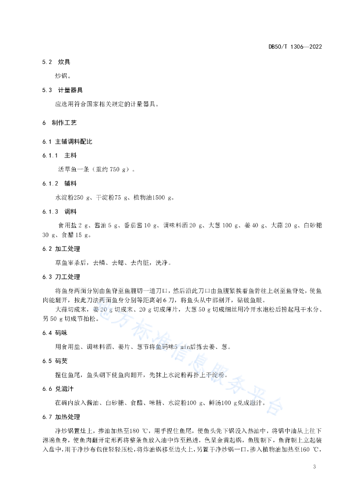 DB50/T 1306-2022 渝菜 糖醋脆皮鱼烹饪技术规范