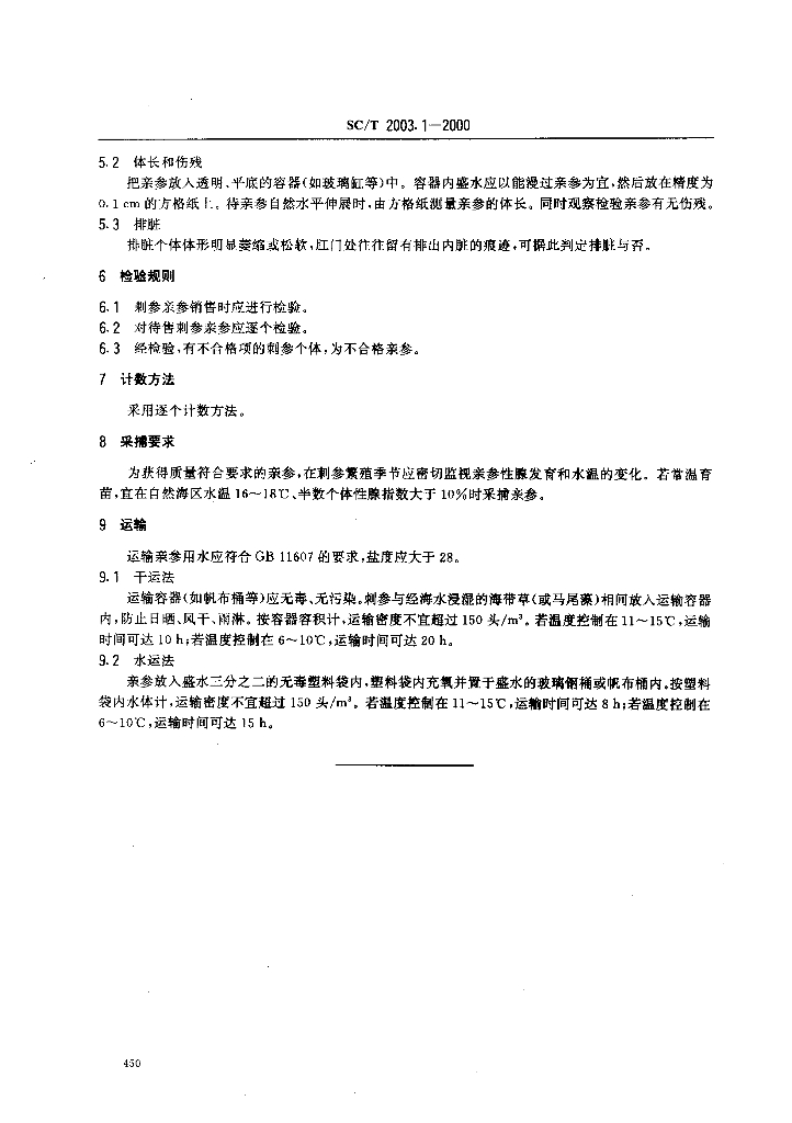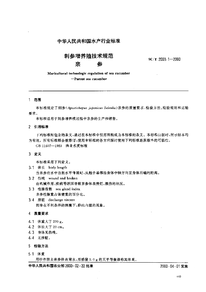 SC/T 2003.1-2000 刺参增养殖技术规范 亲参