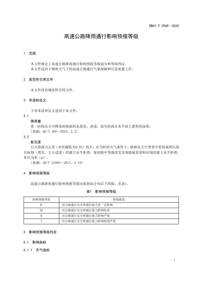 DB41/T 2969-2025 高速公路降雨通行影响预报等级