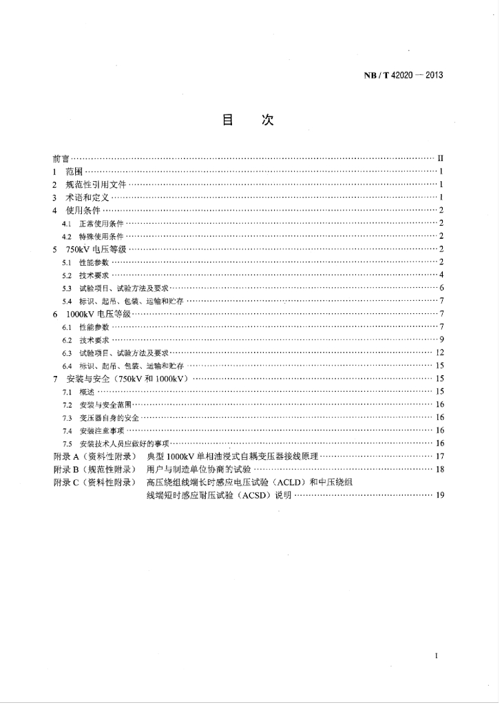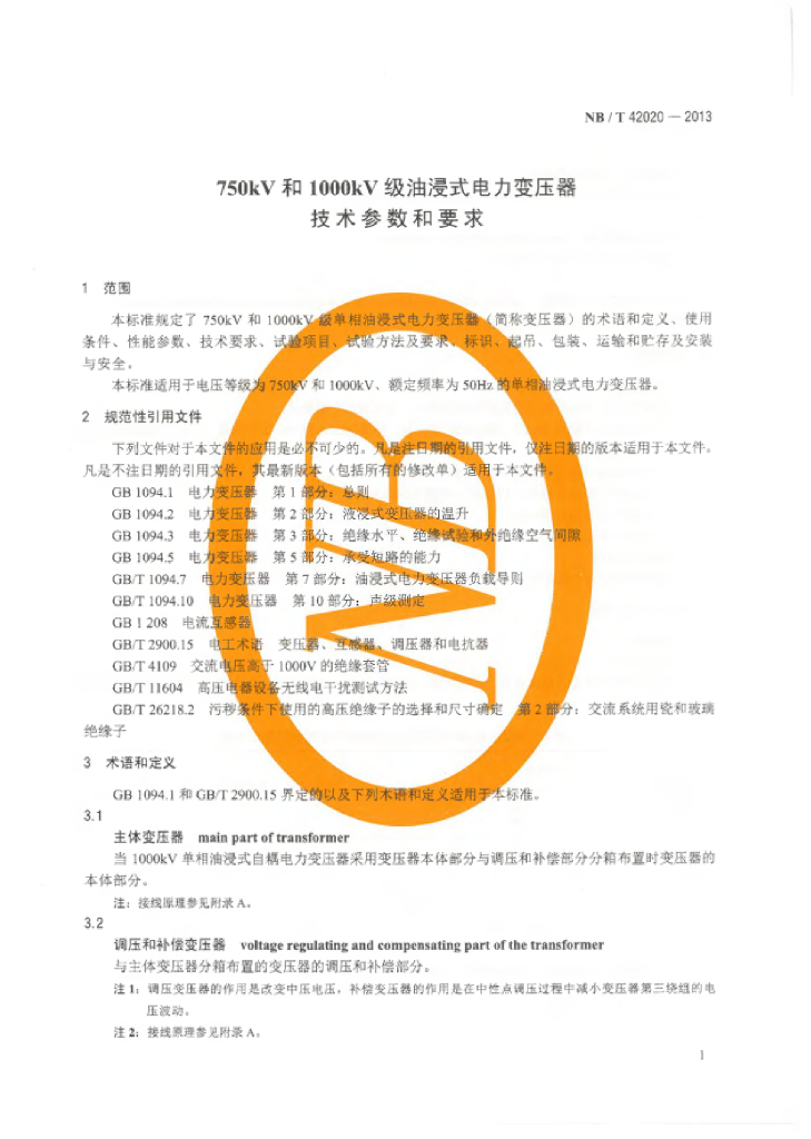 NB/T 42020-2013 750kV和1000kV级油浸式电力变压器技术参数和要求