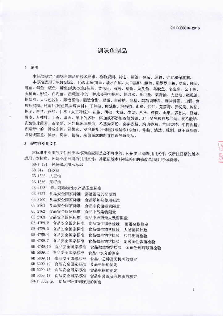 Q/LFS 0001S-2016 成都市隆福食品有限责任公司 调味鱼制品