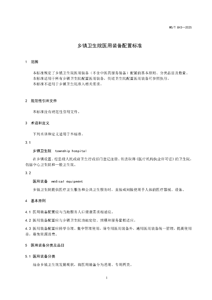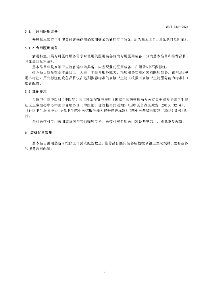 WS 843-2025 乡镇卫生院医用装备配置标准