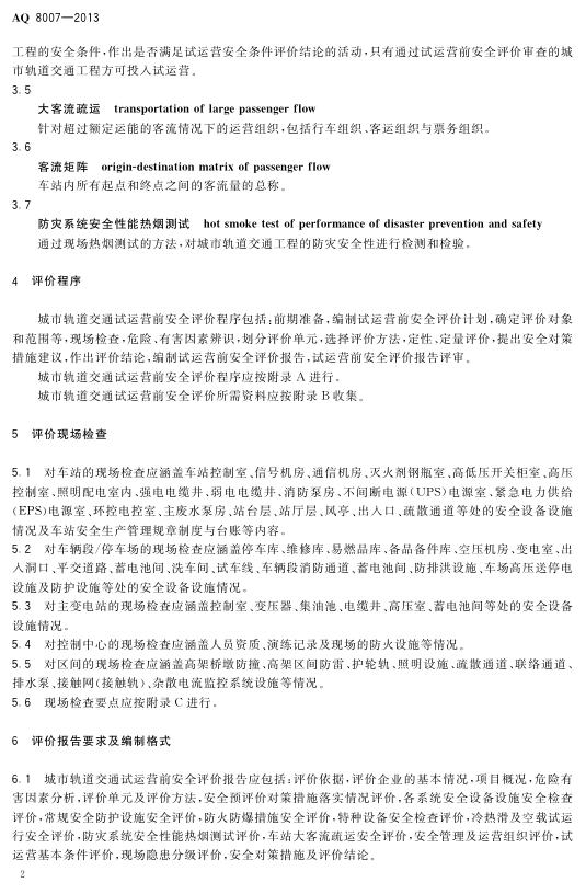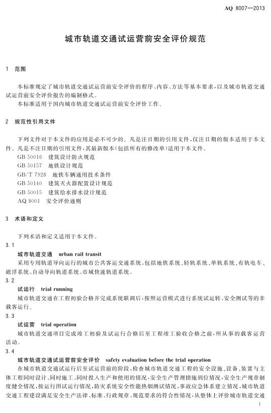 AQ/T 8007-2013 城市轨道交通试运营前安全评价规范
