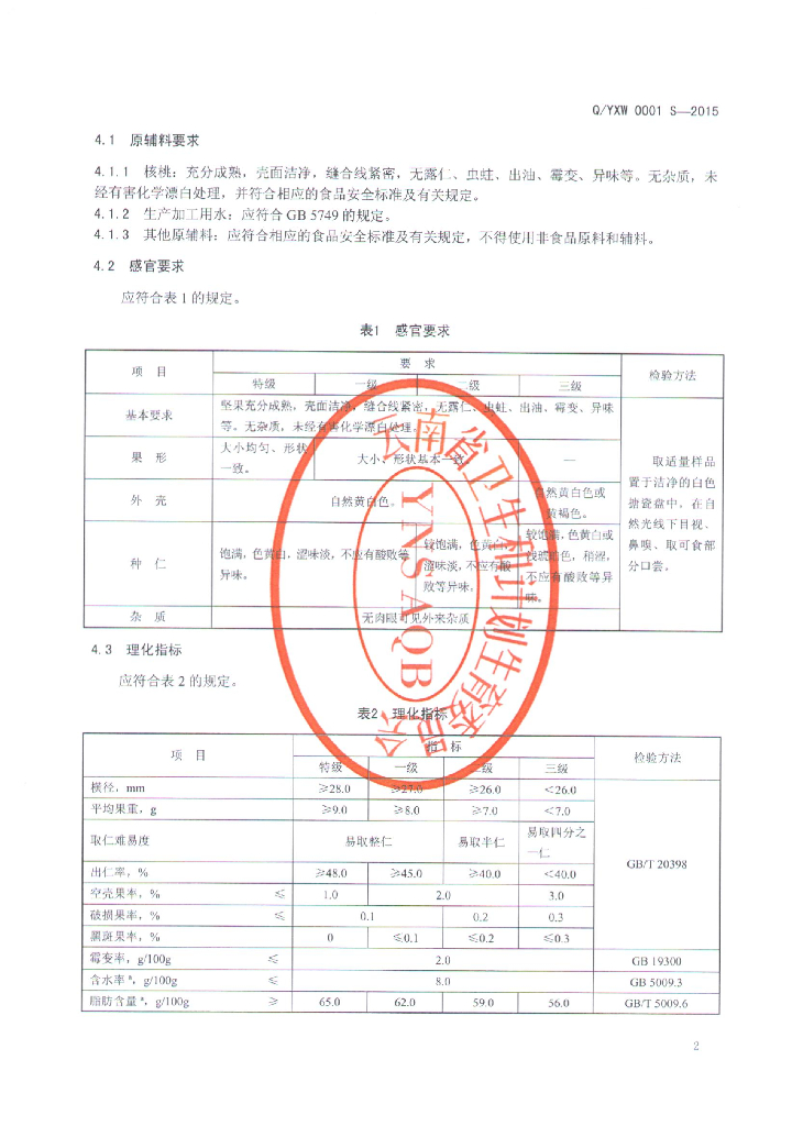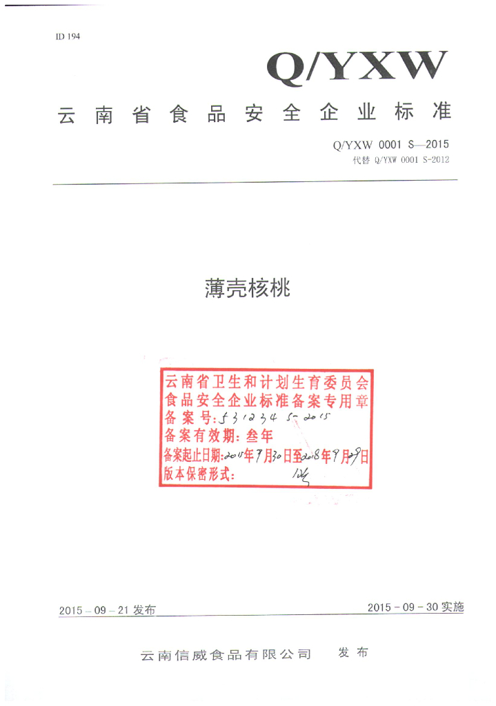 Q/YXW 0001S-2015 云南信威食品有限公司 薄壳核桃