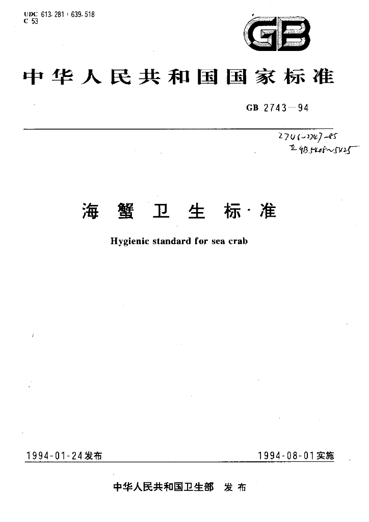 GB 2743-1994 海蟹卫生标准
