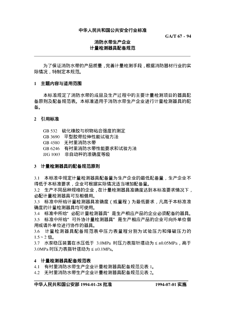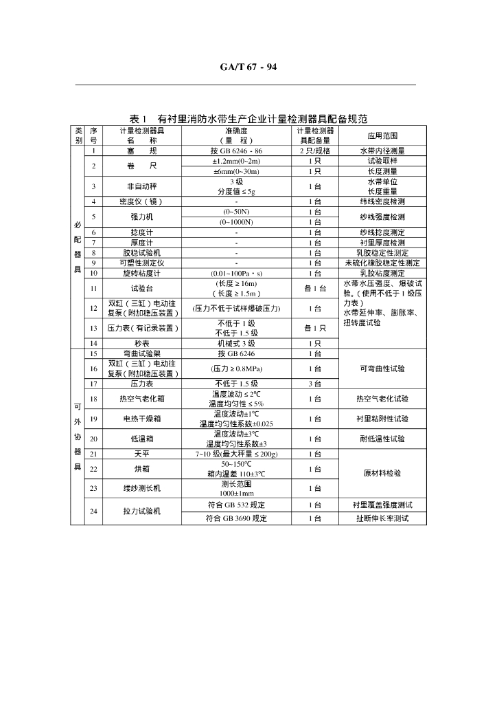 GA/T 67-1994 消防水带生产企业计量检测器具配备规范