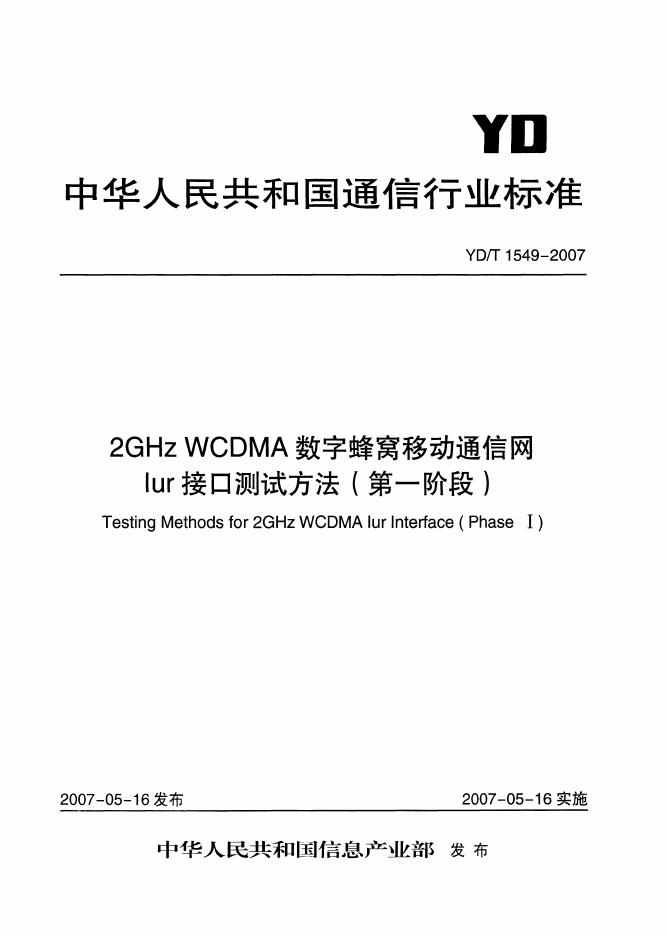 YD/T 1549-2007 2GHz WCDMA数字蜂窝移动通信网 Iur接口测试方法(第一阶段)