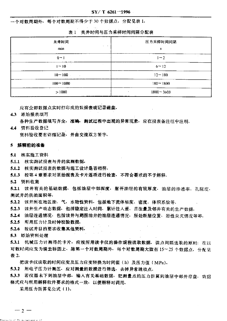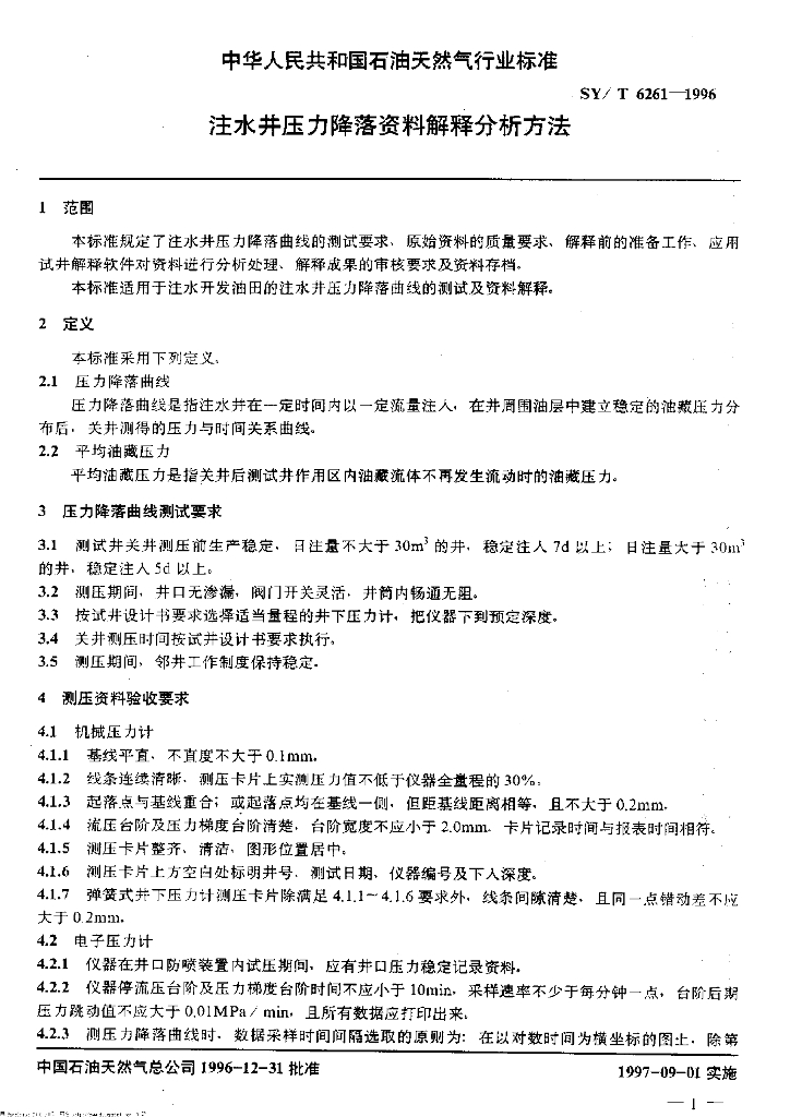 SY/T 6261-1996 注水井压力降落资料解释分析方法