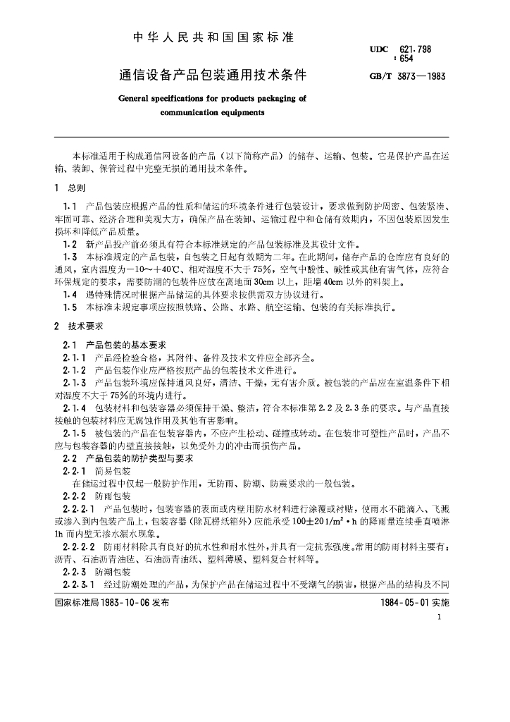GB/T 3873-1983 通信设备产品包装通用技术条件