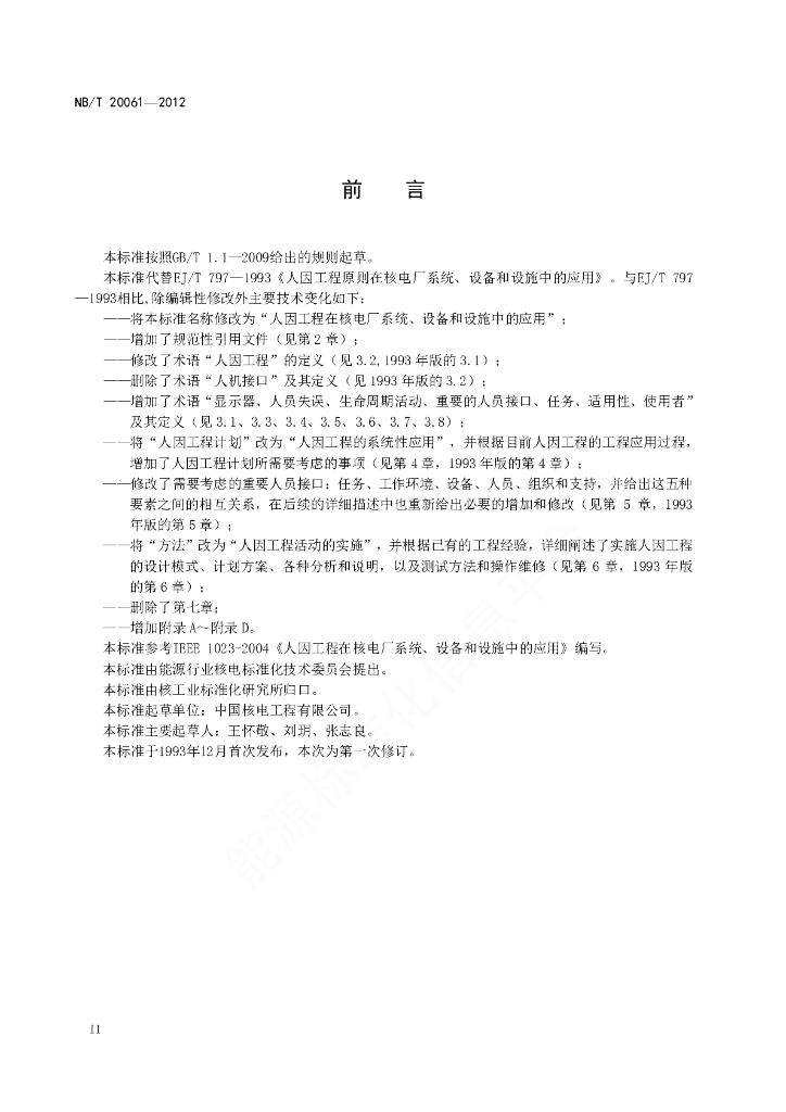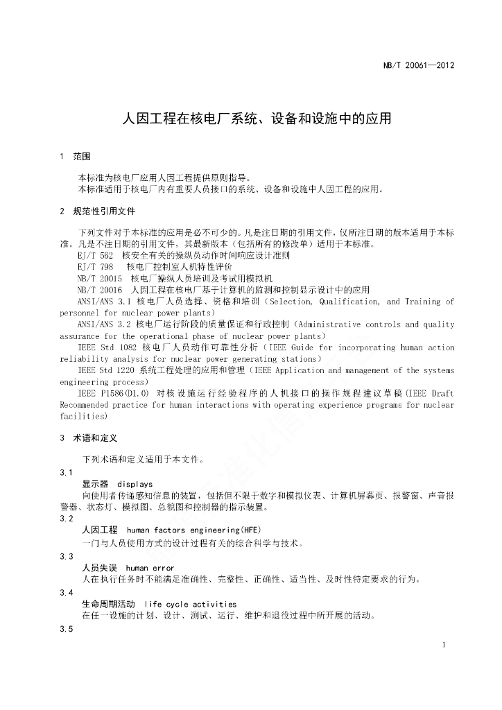 NB/T 20061-2012 人因工程在核电厂系统、设备和设施中的应用