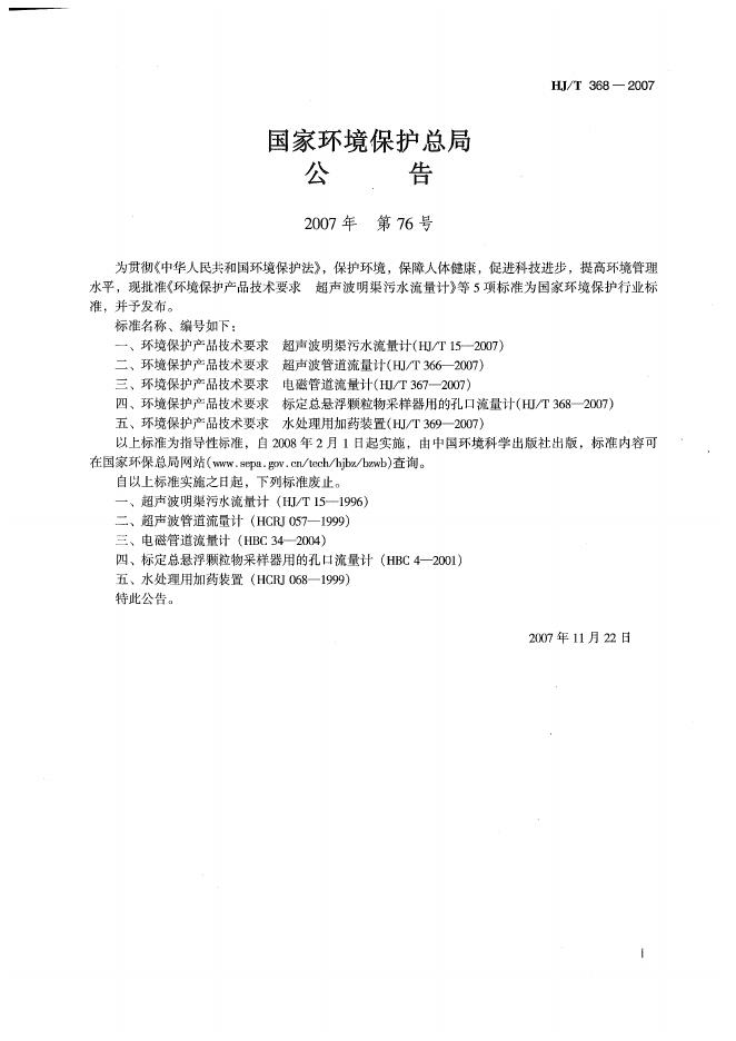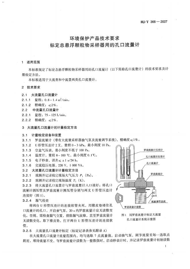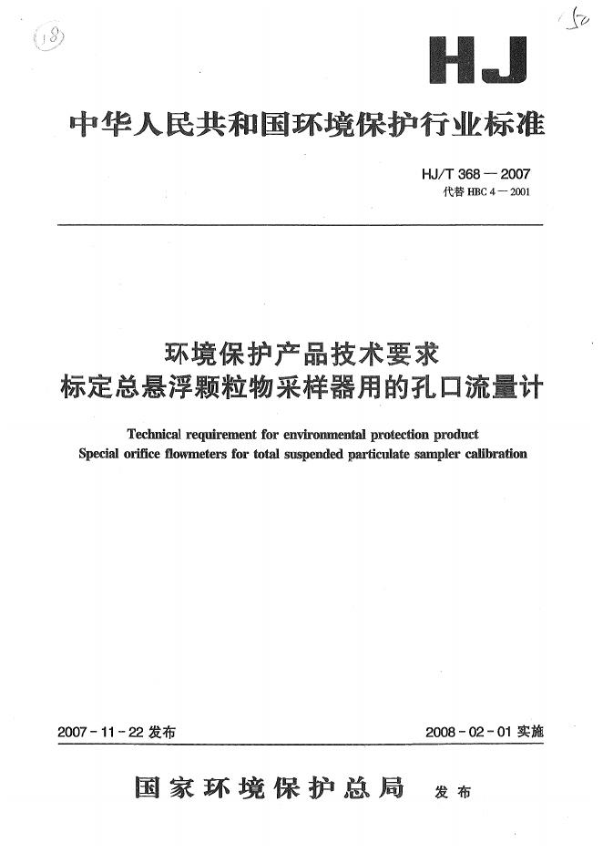 HJ/T 368-2007 环境保护产品技术要求 标定总悬浮颗粒物采样器用的孔口流量计技术要求及检测方法
