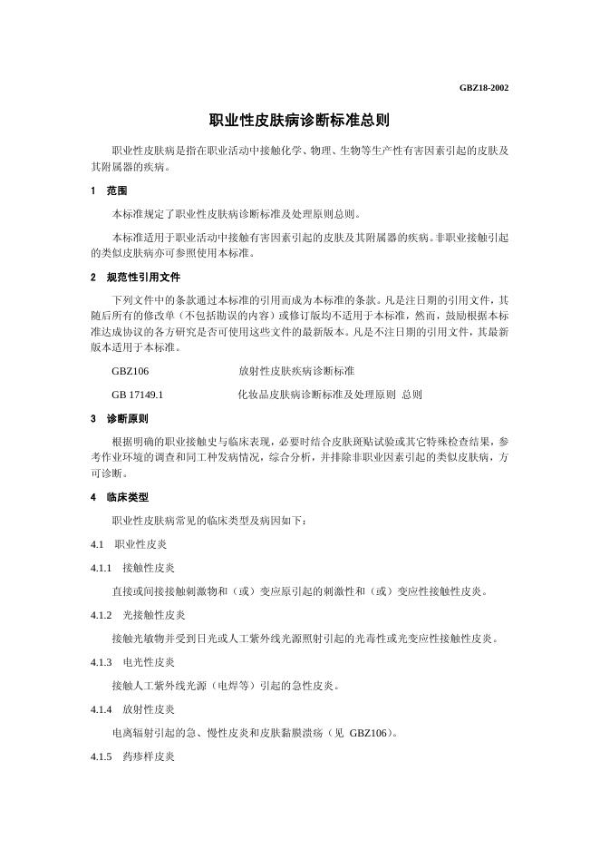 GBZ 18-2002 职业性皮肤病诊断标准(总则)