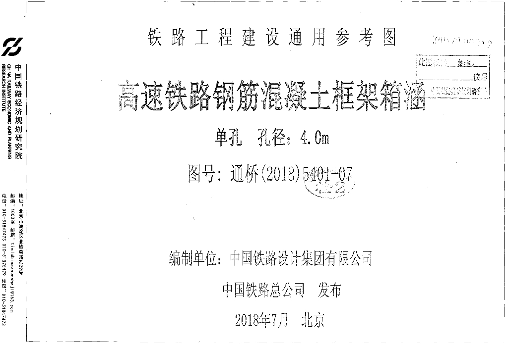 通桥(2018)5401-07 高速铁路钢筋混凝土框架箱涵单孔、孔径:4.0m图集