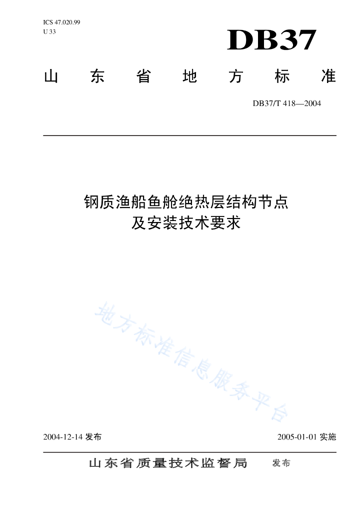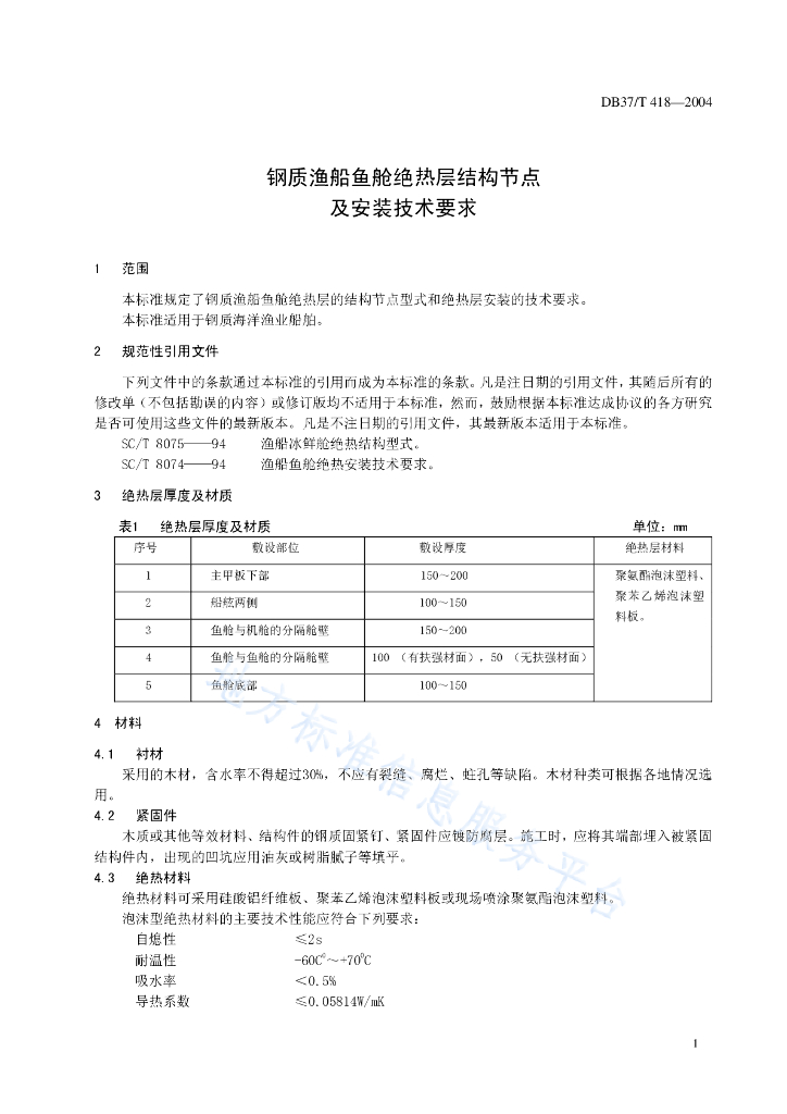 DB37/T 418-2004 钢质渔船鱼舱绝热层结构节点及安装技术要求