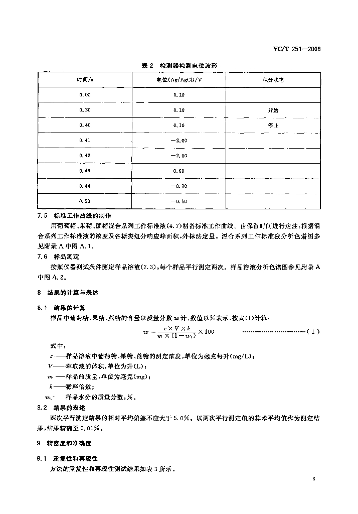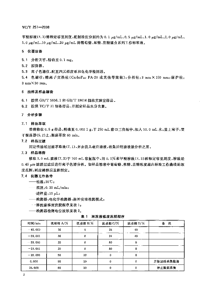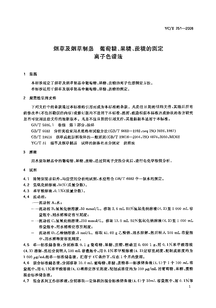 YC/T 251-2008 烟草及烟草制品 葡萄糖、果糖、蔗糖的测定 离子色谱法