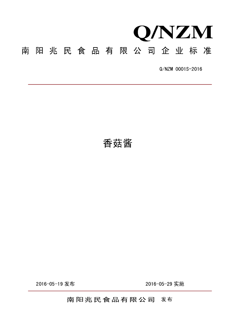 Q/NZM 0001S-2016 南阳兆民食品有限公司 香菇酱