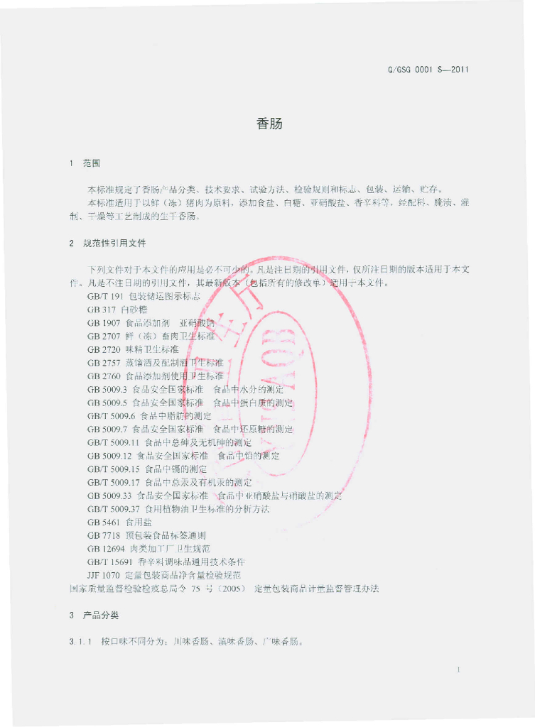 Q/GSG 0001S-2011 香肠
