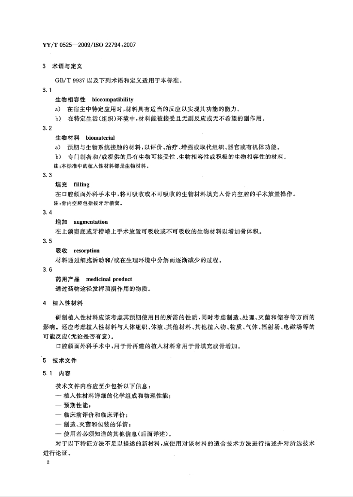 YY/T 0525-2009/IS0 22794: 2007 牙科学口腔颌面外科用骨填充及骨增加植入性材料技术文件内容