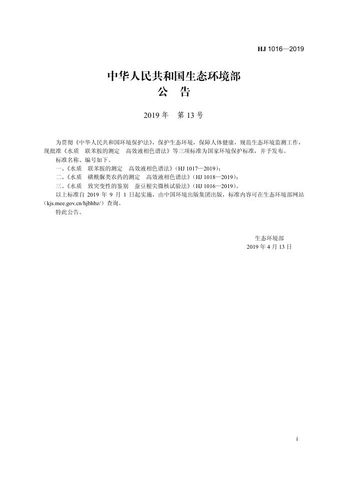 HJ 1016-2019 水质 致突变性的鉴别蚕豆根尖微核试验法