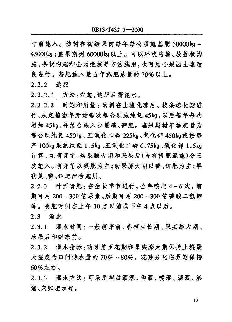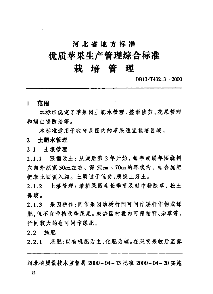 DB13/T 432.3-2000 优质苹果生产管理综合标准 栽培管理