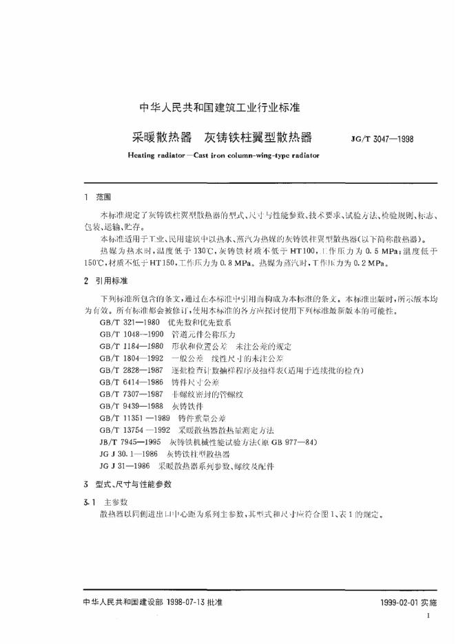CJ/T 3047-1998 采暖散热器-灰铸铁柱翼型散热器