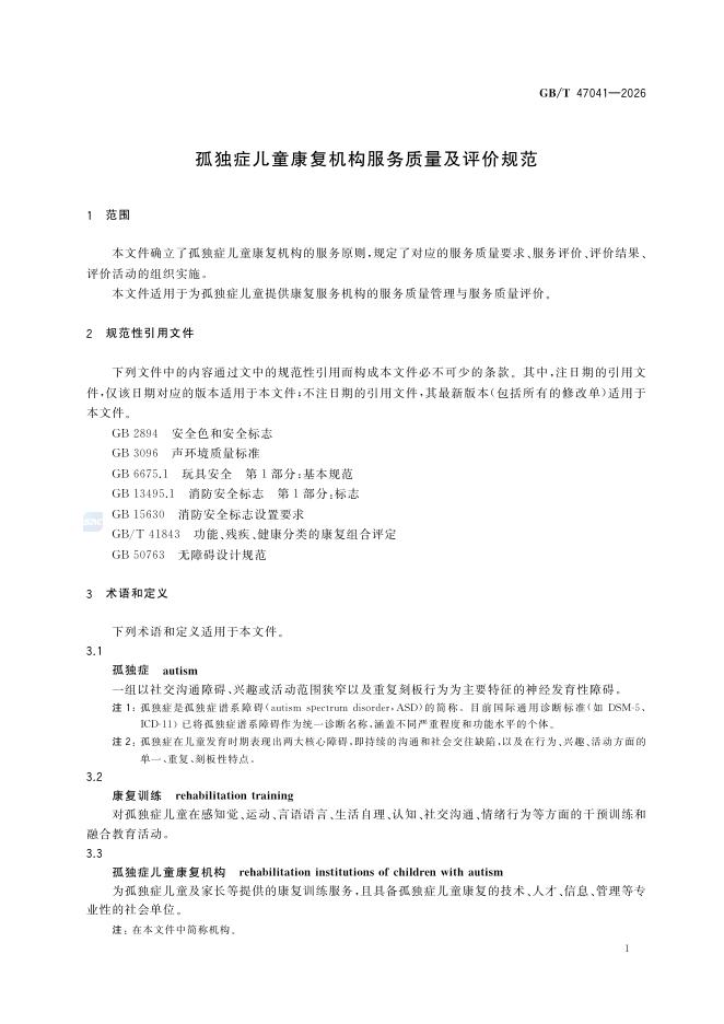 GB/T 47041-2026 孤独症儿童康复机构服务质量及评价规范