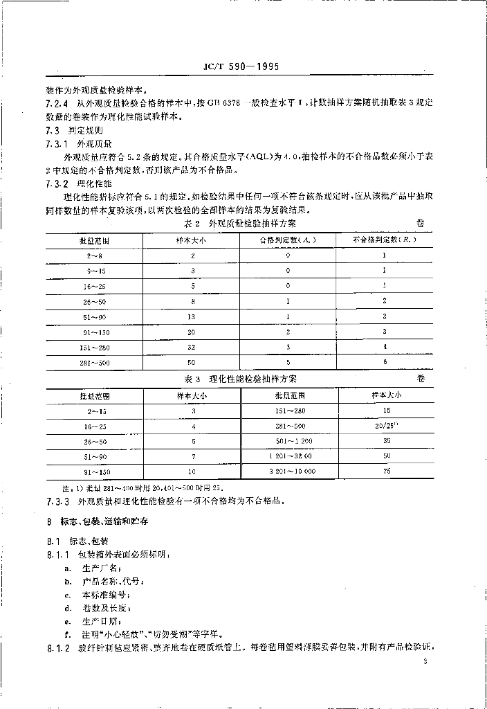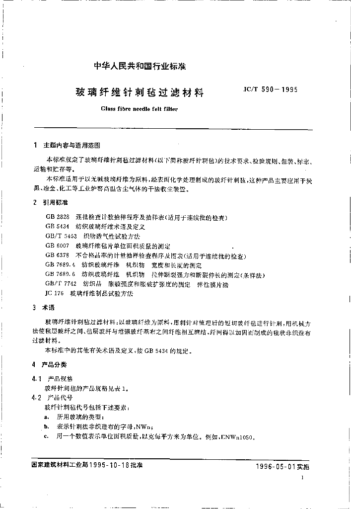 JC/T 590-1995 玻璃纤维针刺毡过滤材料