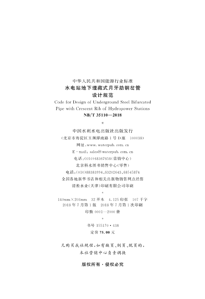 NB/T 35110-2018 水电站地下埋藏式月牙肋钢岔管设计规范