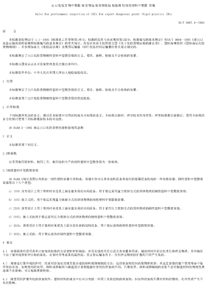 SN/T 0987.4-2001 出口危险货物中型散装货物包装容器 性能检验规程 刚性塑料中型散货箱