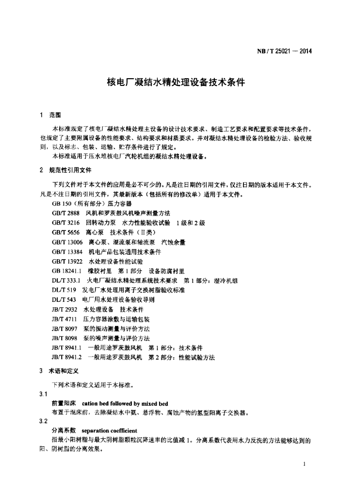 NB/T 25021-2014 核电厂凝结水精处理设备 技术条件