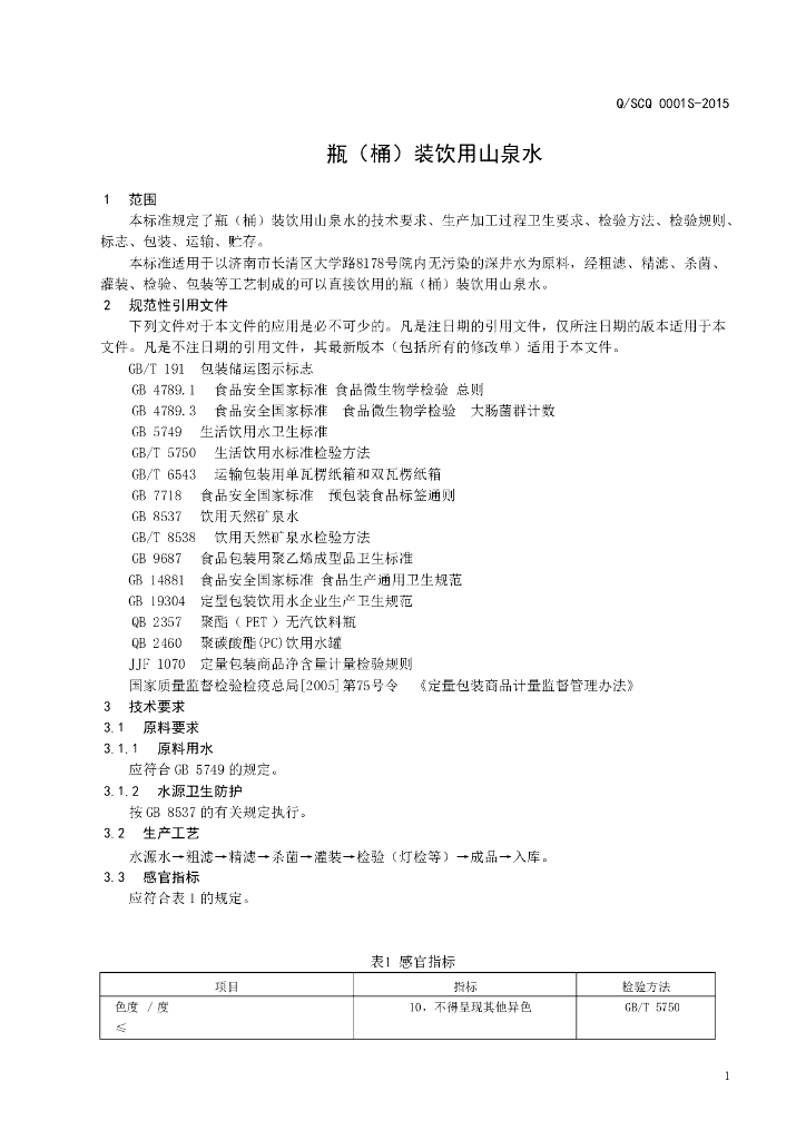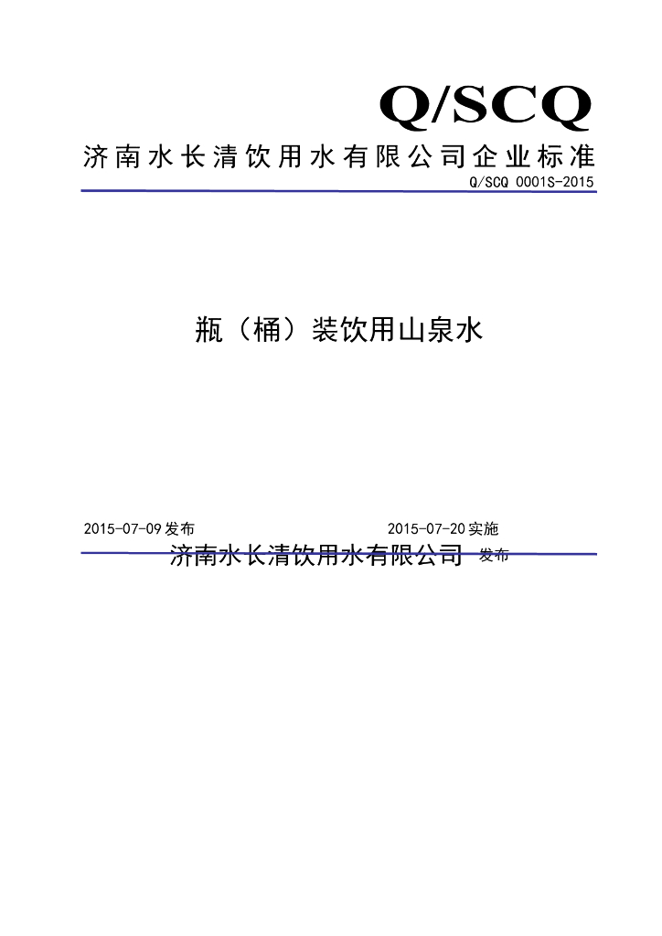 Q/SCQ 0001S-2015 济南水长清饮用水有限公司 瓶(桶)装饮用山泉水