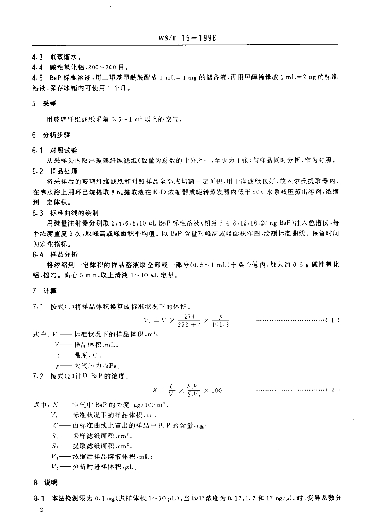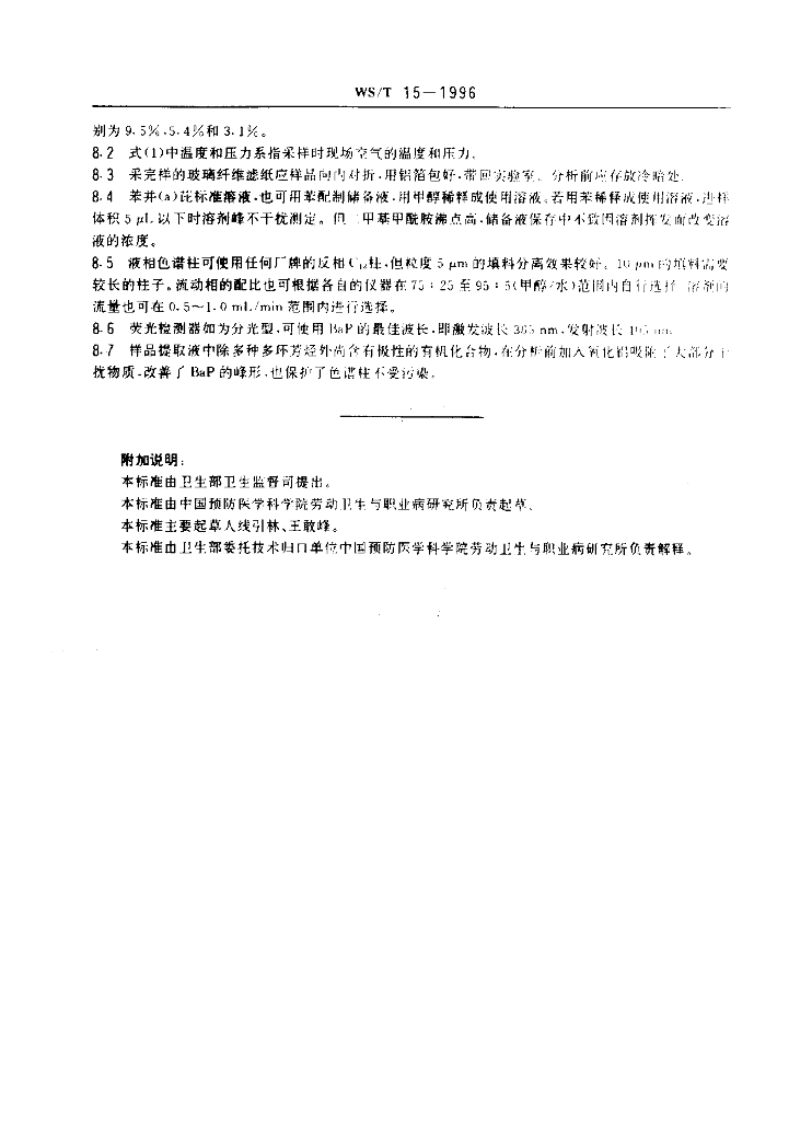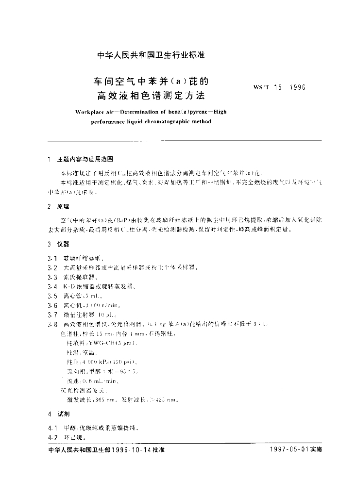 WS/T 15-1996 车间空气中苯并(a)芘的高效液相色谱测定方法