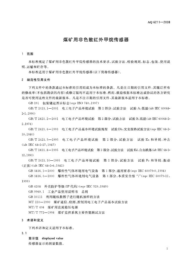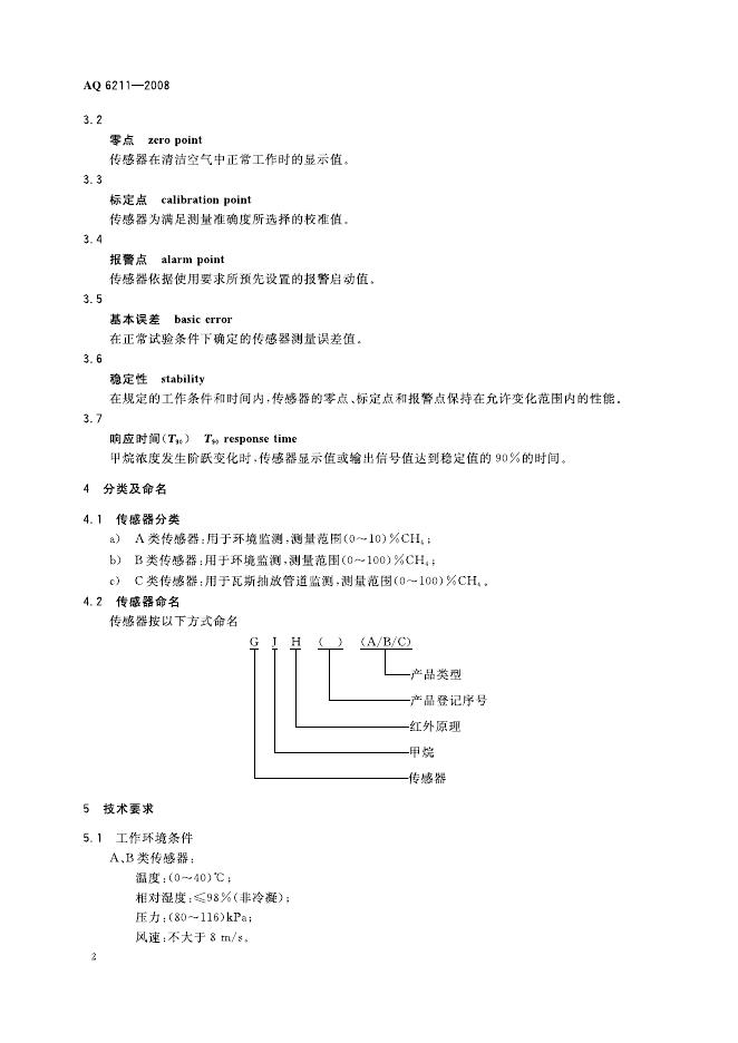 AQ/T 6211-2008 煤矿用非色散红外甲烷传感器