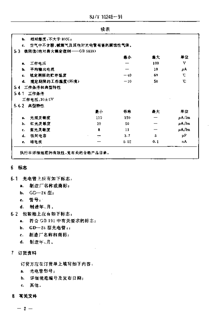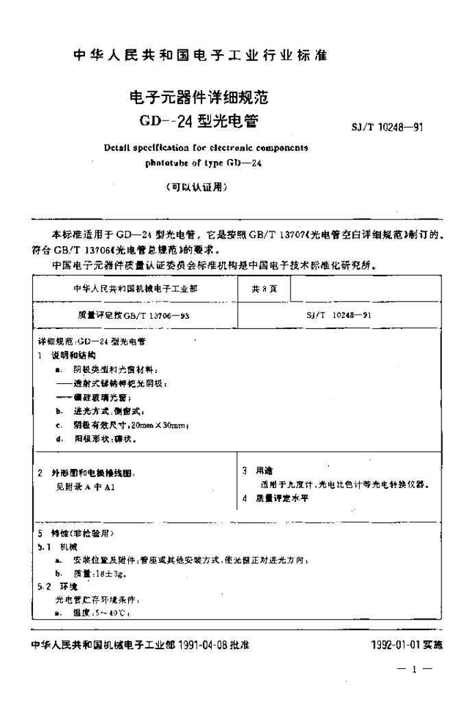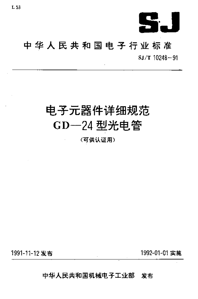 SJ/T 10248-1991 电子元器件详细规范GD-24型光电管(可供认证用)