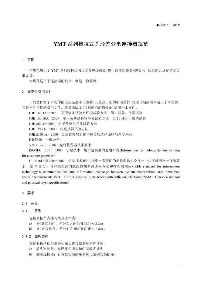HB 8311-2012(2017) YMT系列推拉式圆形差分电连接器规范