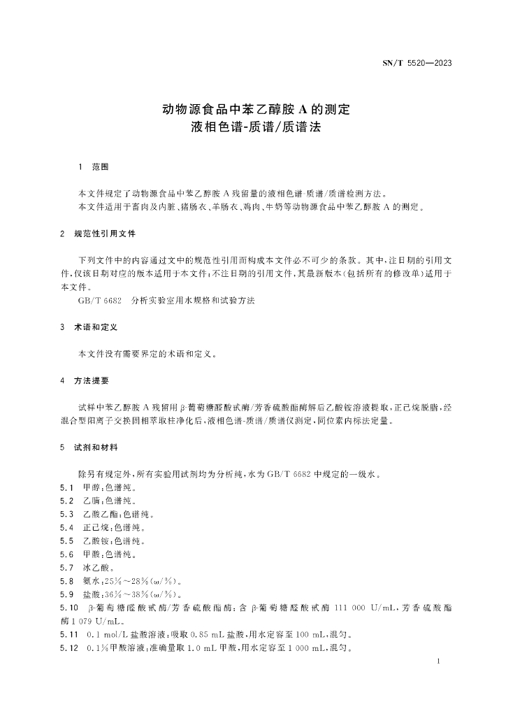 SN/T 5520-2023 动物源食品中苯乙醇胺A的测定 液相色谱-质谱/质谱法