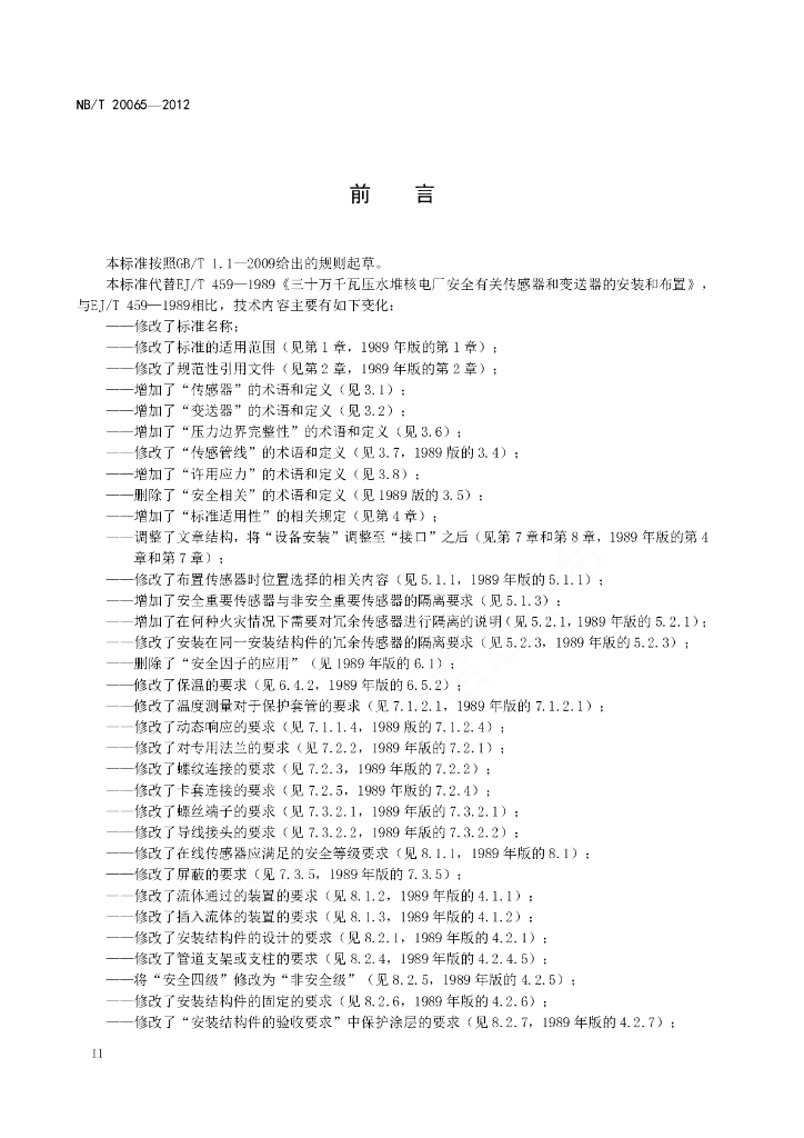 NB/T 20065-2012 核电厂安全重要传感器和变送器的安装和布置要求