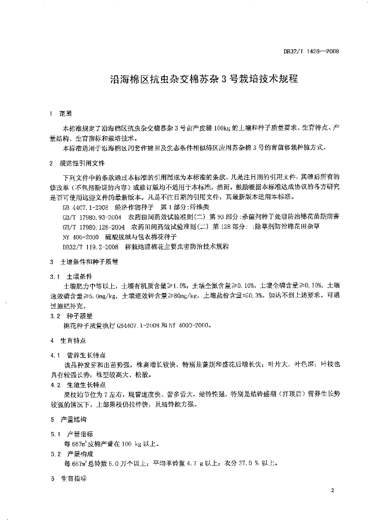 DB32/T 1426-2009 沿海棉区抗虫杂交棉苏杂3号栽培技术规程