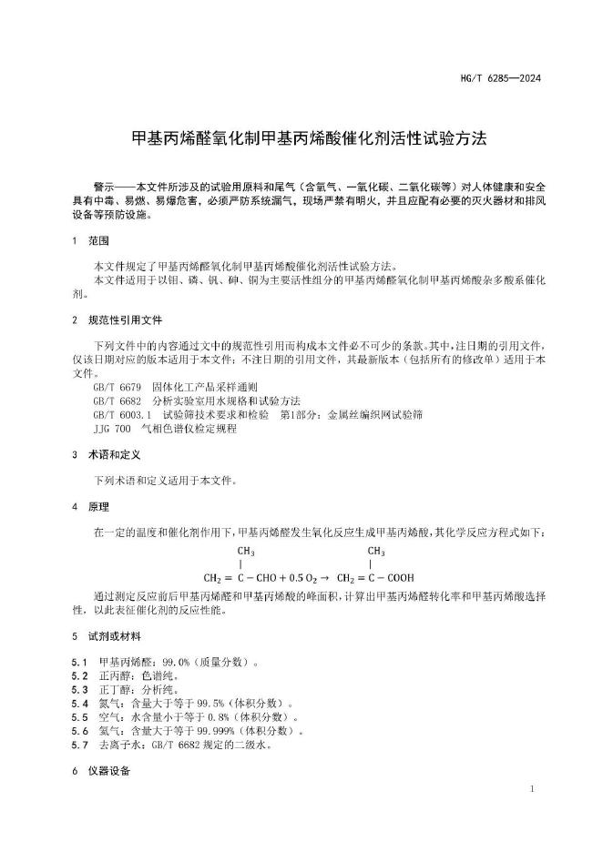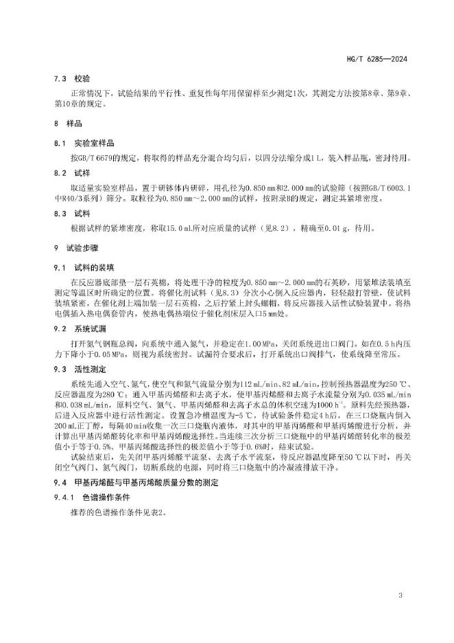 HG/T 6285-2024 甲基丙烯醛氧化制甲基丙烯酸催化剂活性试验方法