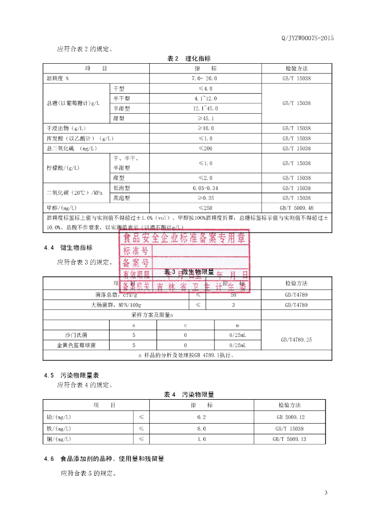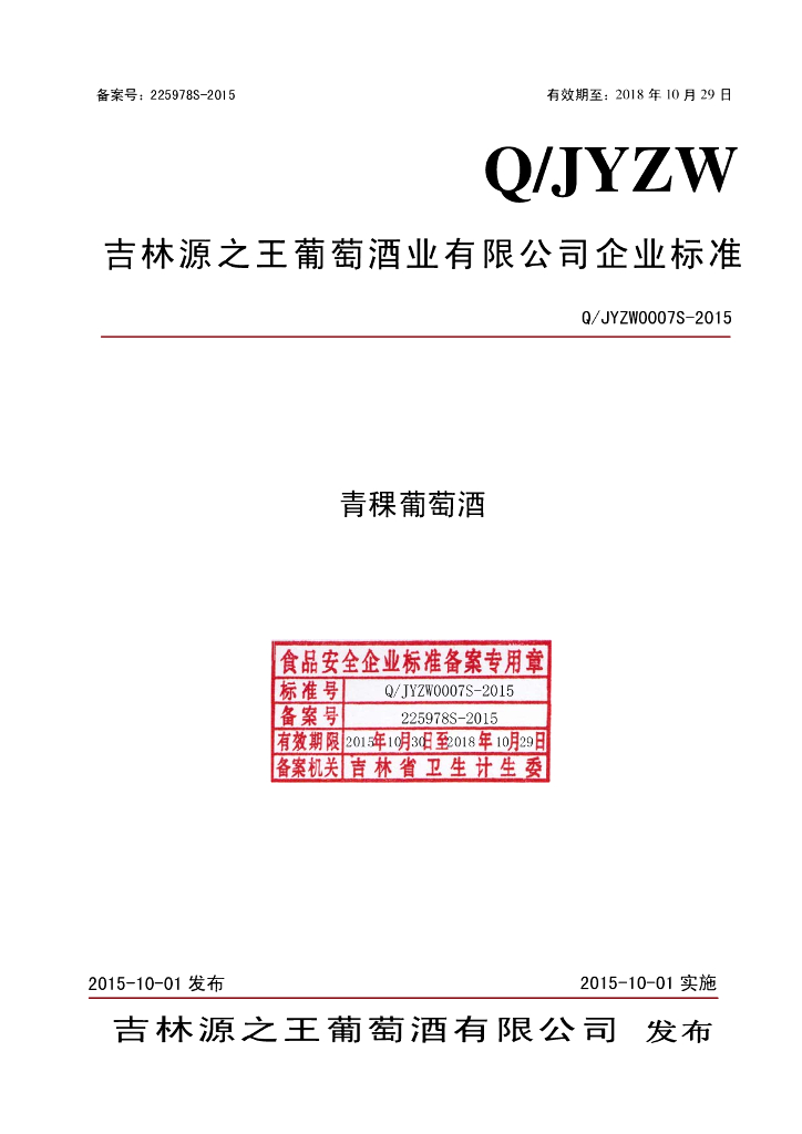 Q/JYZW 0007S-2015 吉林源之王葡萄酒有限公司 青稞葡萄酒