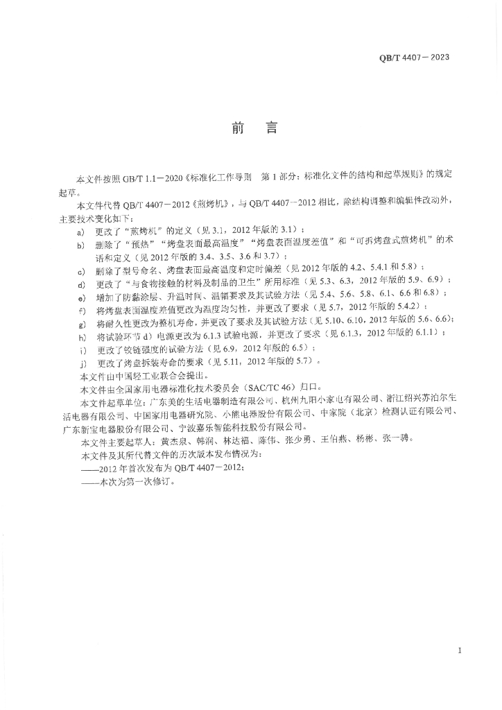 广东美的生活电器制造有限公司、杭州九阳小家电有限公司、浙江绍兴苏泊尔生活电器有限公司、中国家用电器研究院、小熊电器股份有限公司、中家院(北京)检测认证有限公司、广东新宝电器股份有限公司、宁波嘉乐智能科技股份有限公司