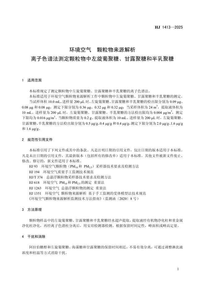 HJ 1413-2025 环境空气 颗粒物来源解析 离子色谱法测定颗粒物中左旋葡聚糖、甘露聚糖和半乳聚糖