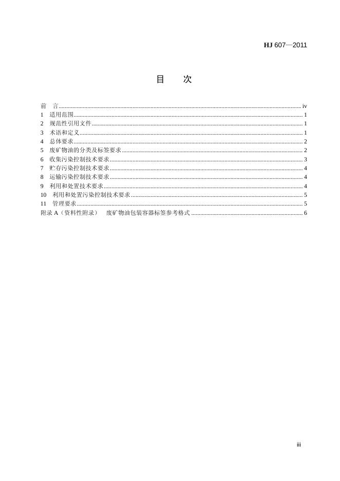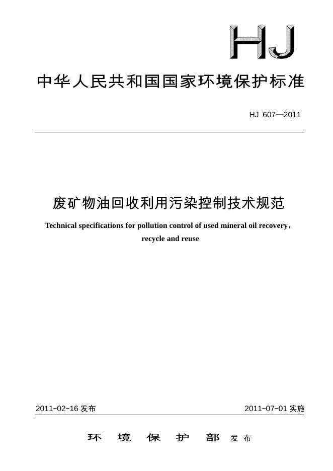 HJ 607-2011 废矿物油回收利用污染控制技术规范