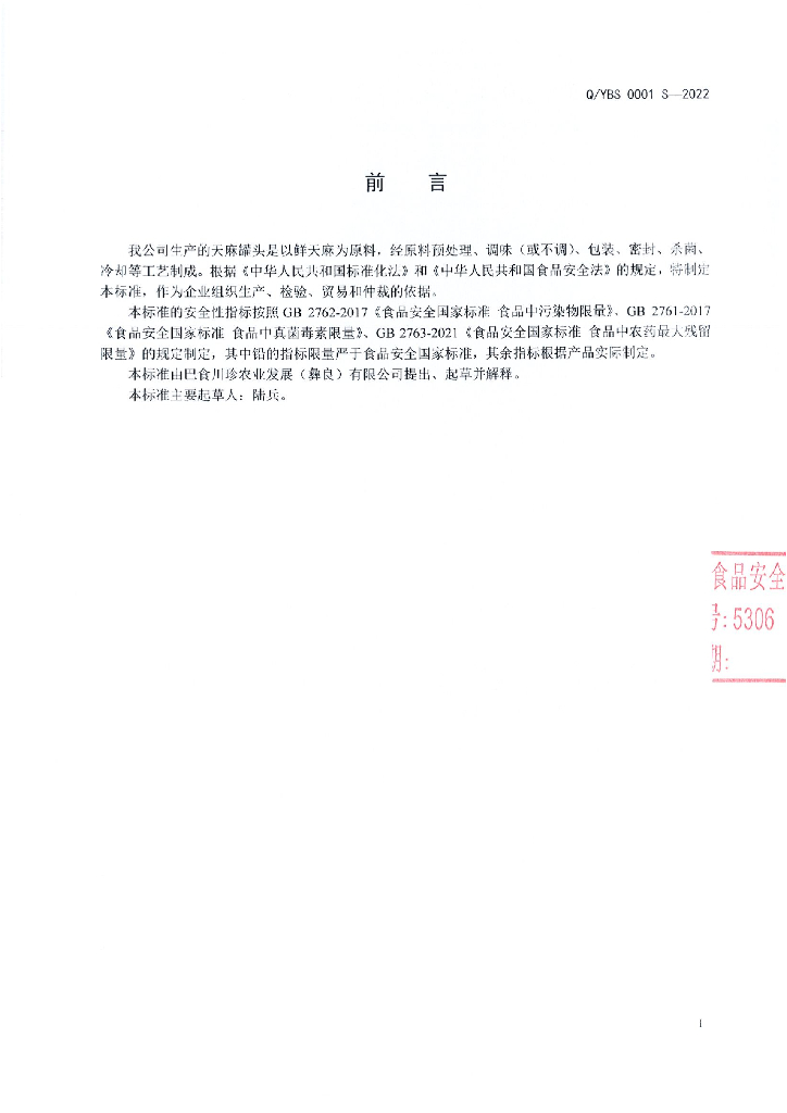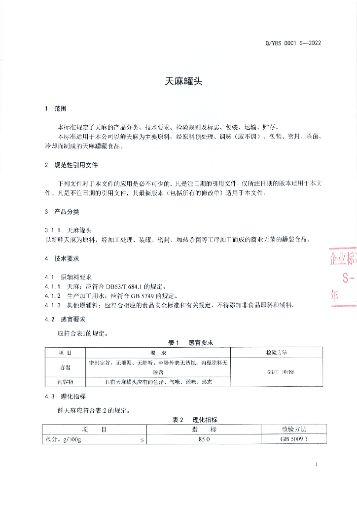 Q/YBS 0001S-2022 天麻罐头